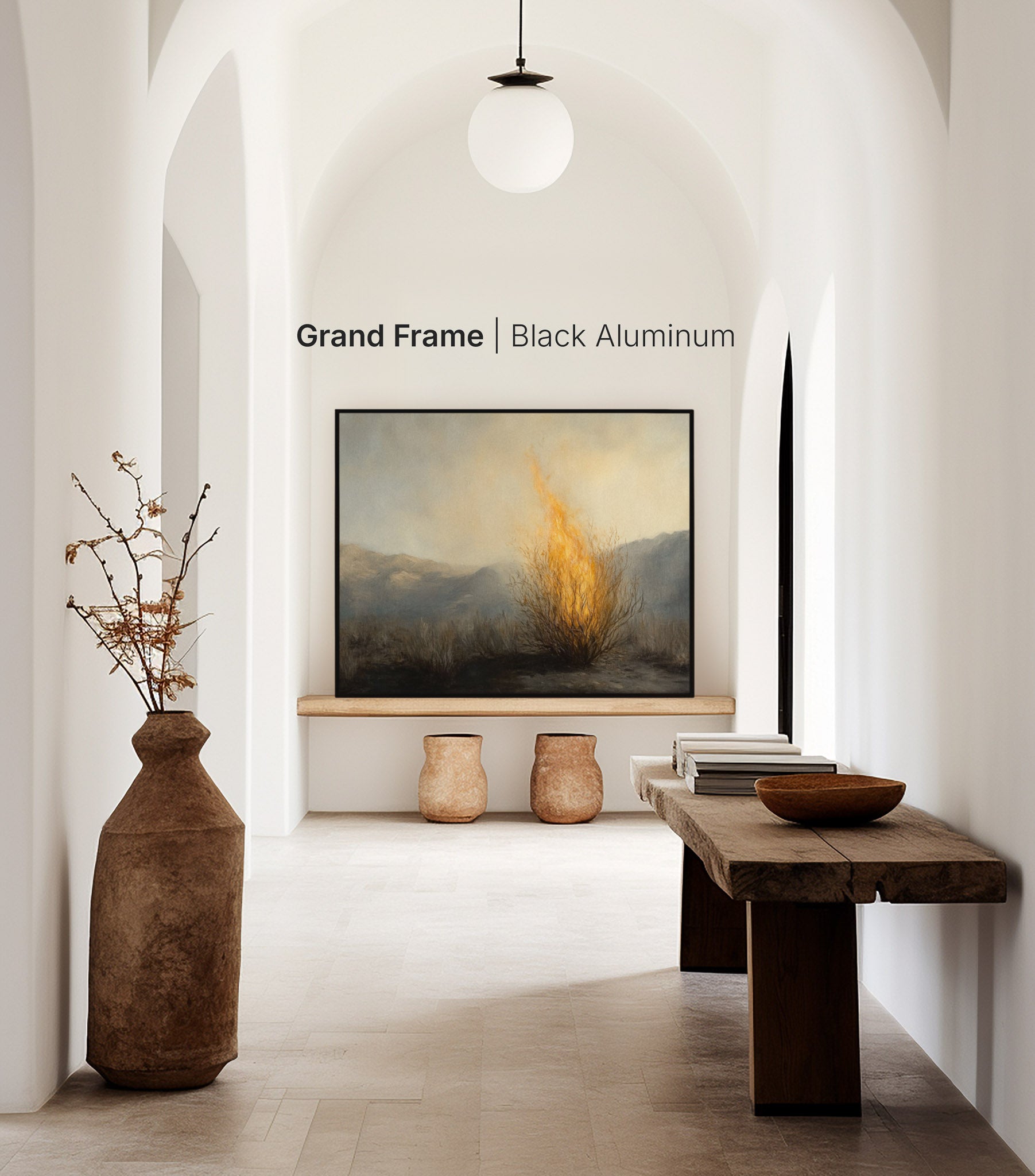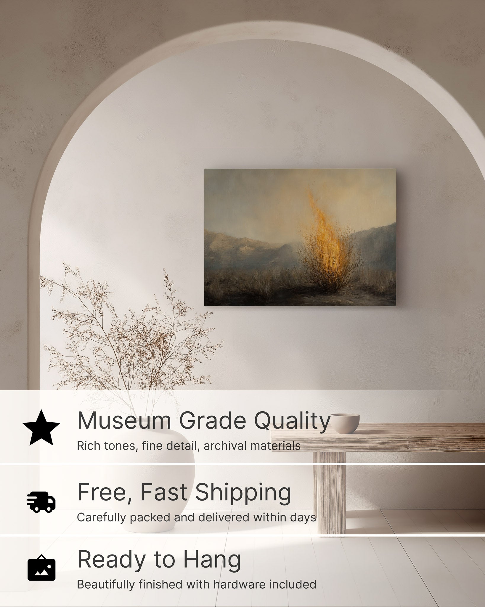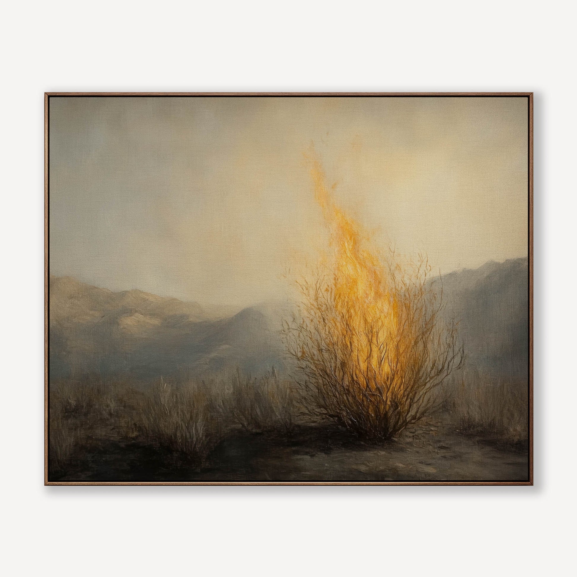 Glowing with the miraculous fire of Horeb, “Burning Bush Encounter” draws the viewer into holy ground. Its rich warm palette creates striking prophetic christian wall art that adds a sense of awe to a living room or prayer space.