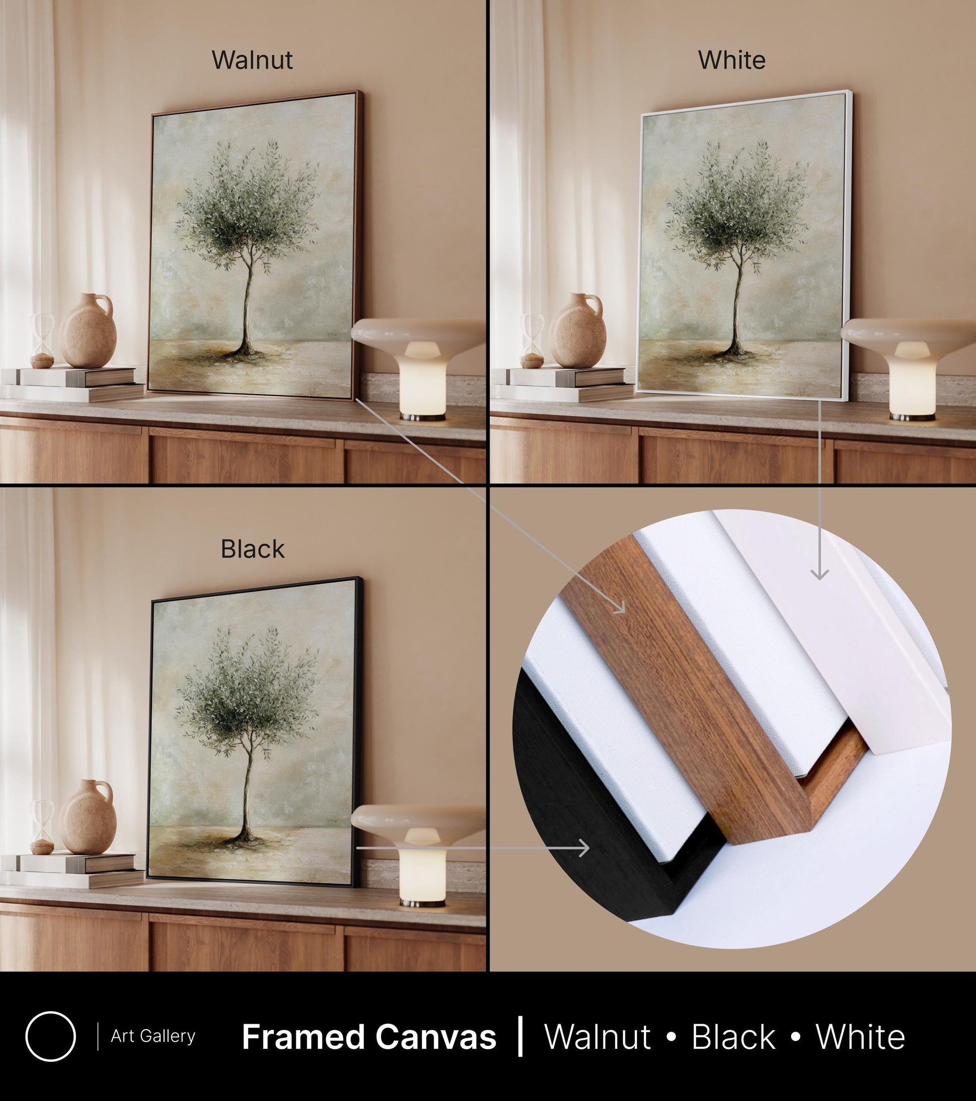 Artist-grade canvas in Walnut, White, or Black wood. Ready to hang.