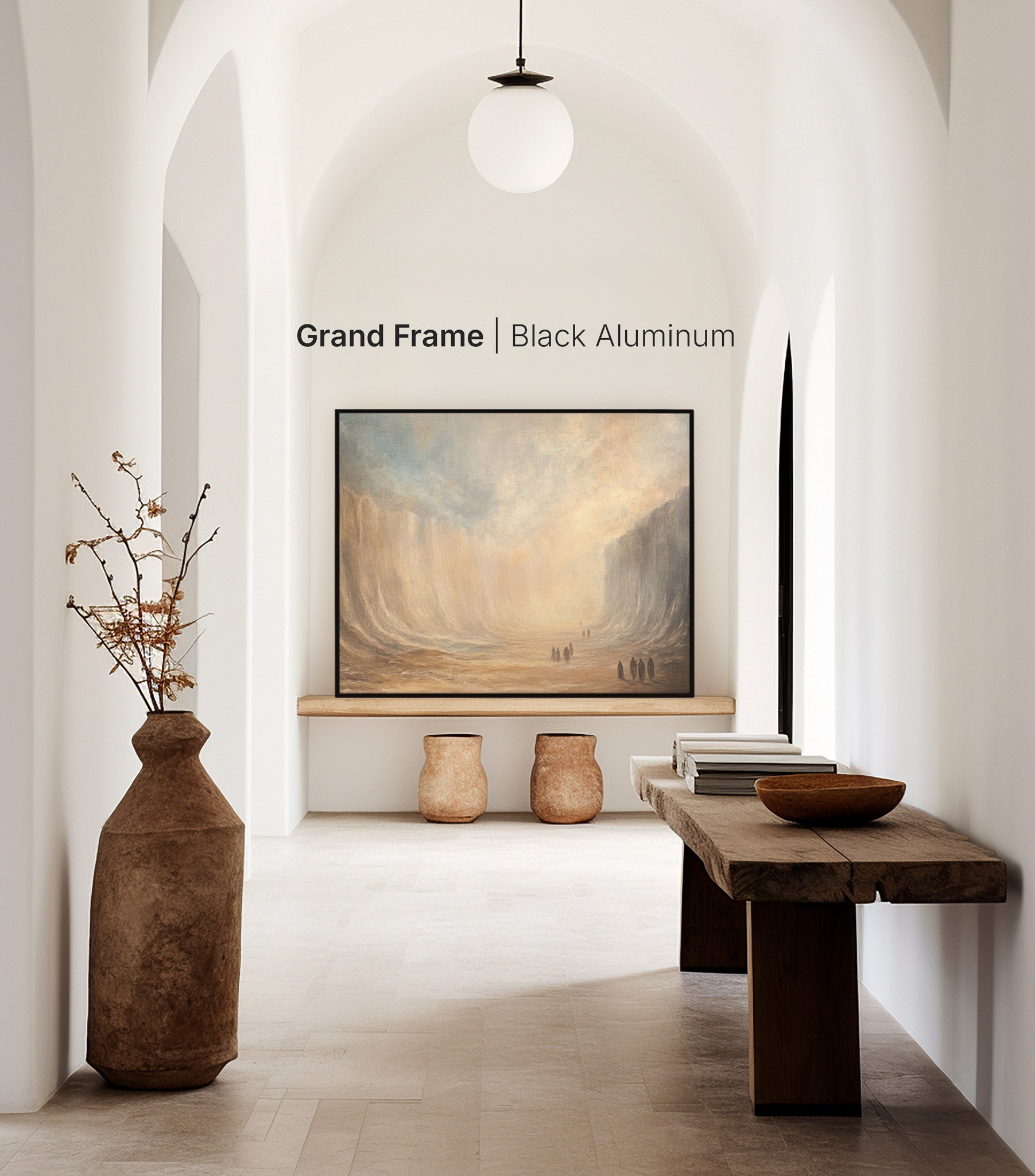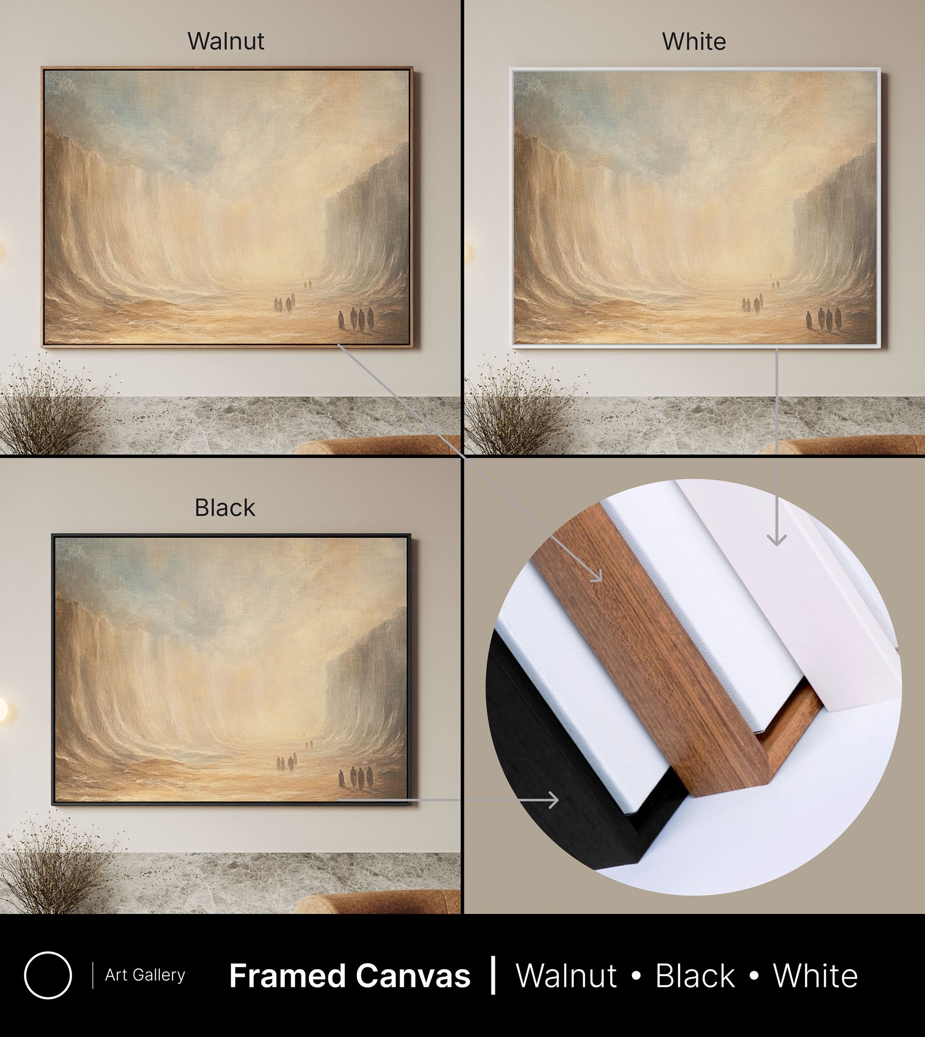 Artist-grade canvas wrap in Walnut, White, or Black wooden floater frame. Ready to hang.