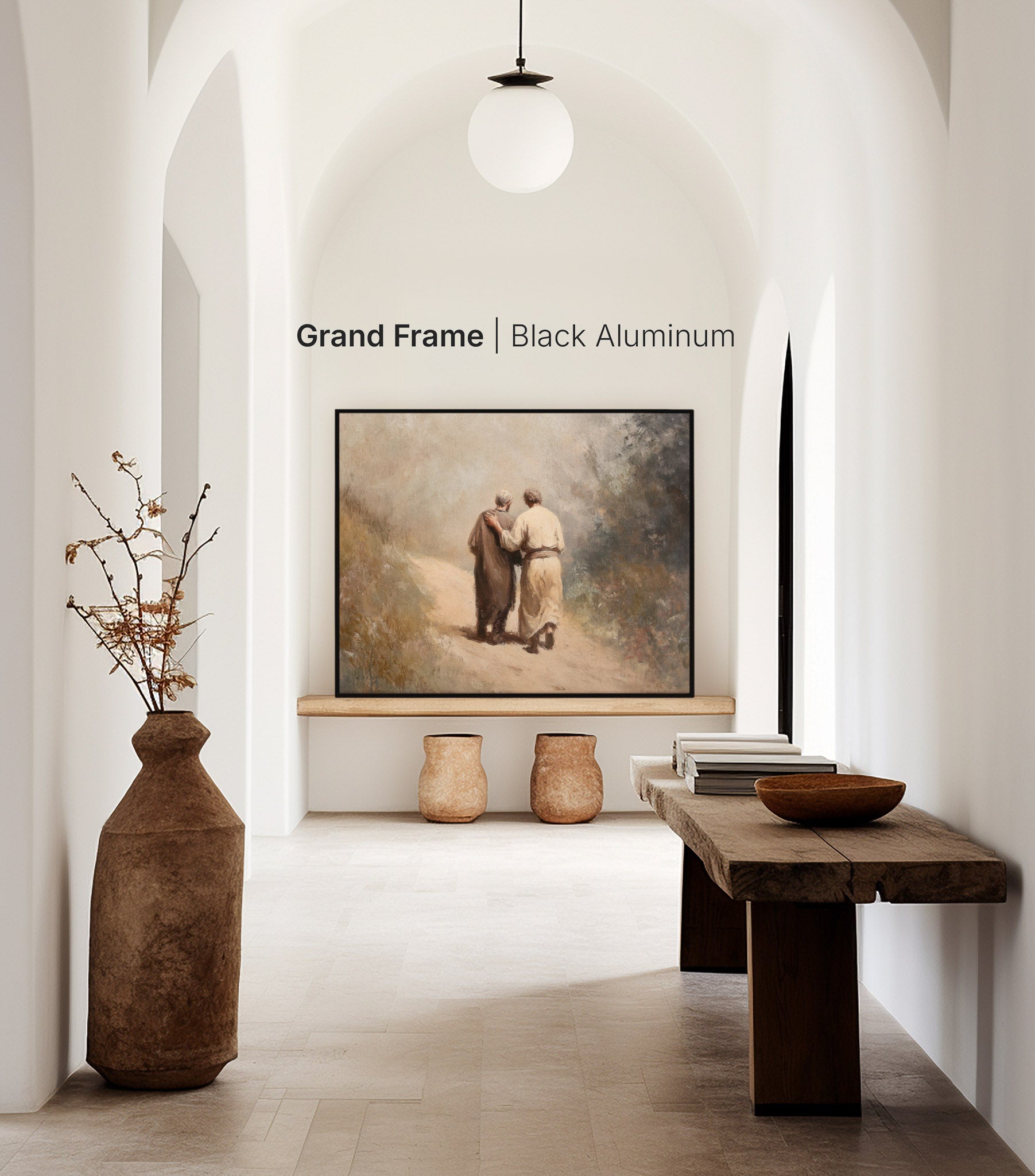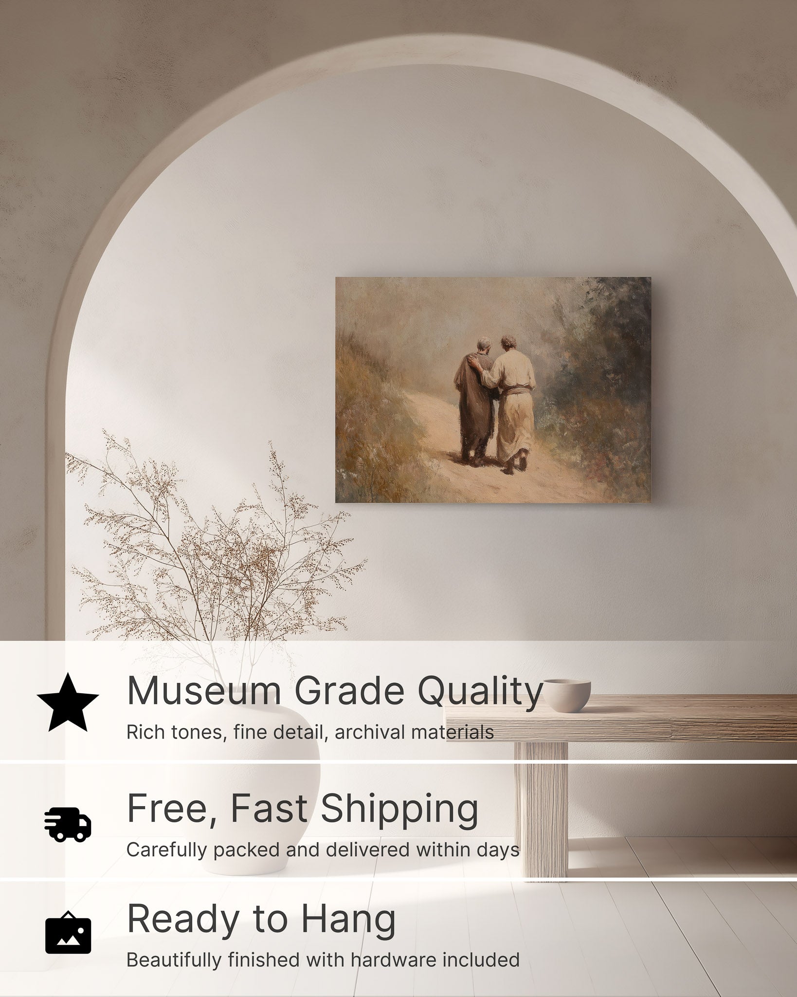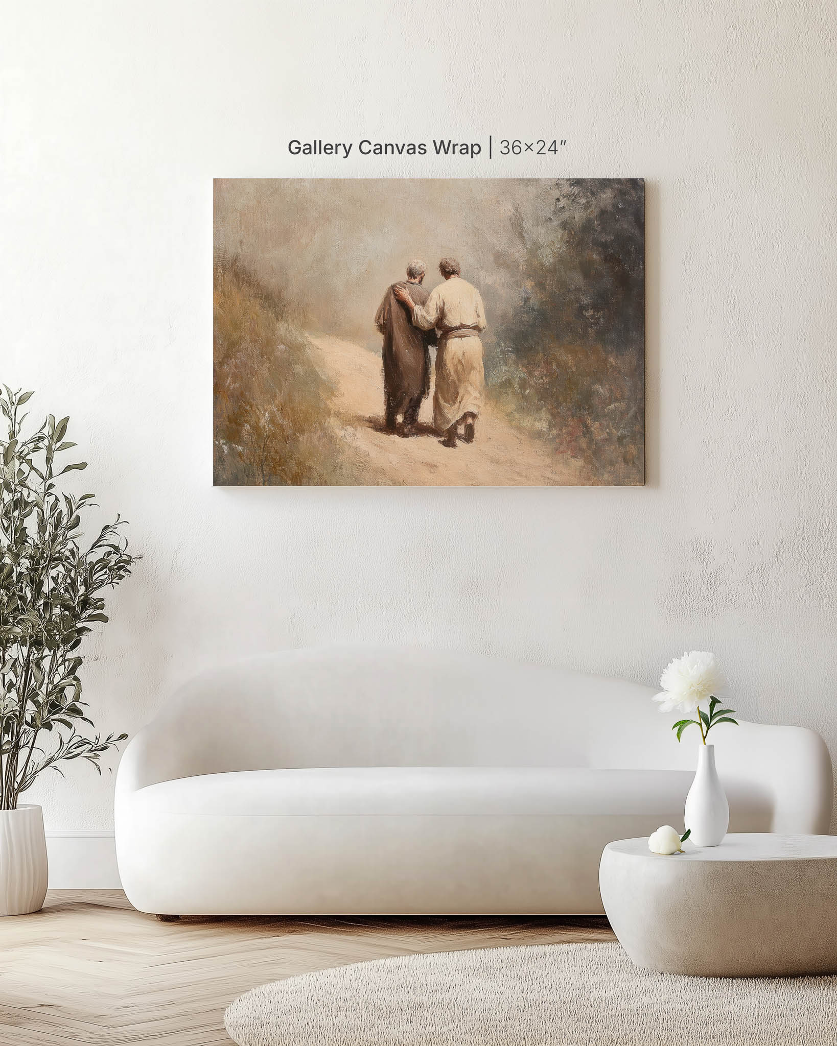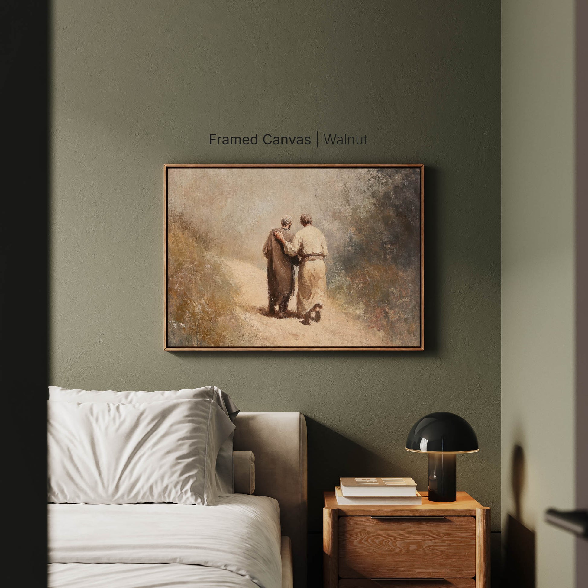 Walking through the quiet Judean hills, “Road to Emmaus” reflects the moment Christ walked with His disciples. Its soft landscape tones create contemplative bible wall art that brings peace and reflection to a hallway or study.