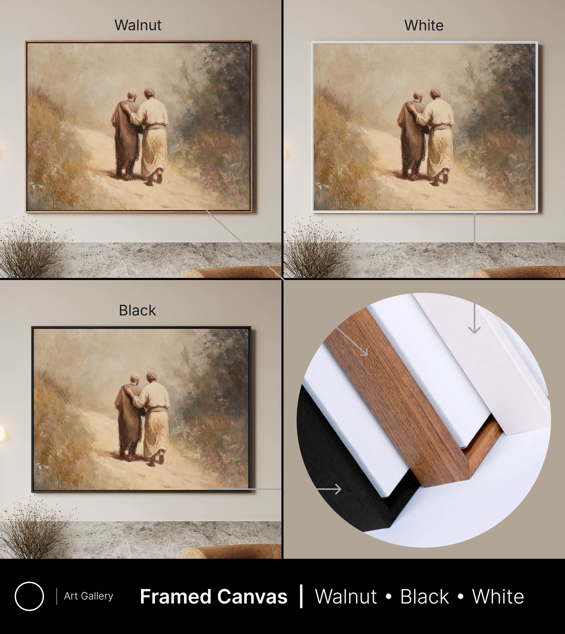 Artist-grade canvas wrap in Walnut, White, or Black wooden floater frame. Ready to hang.