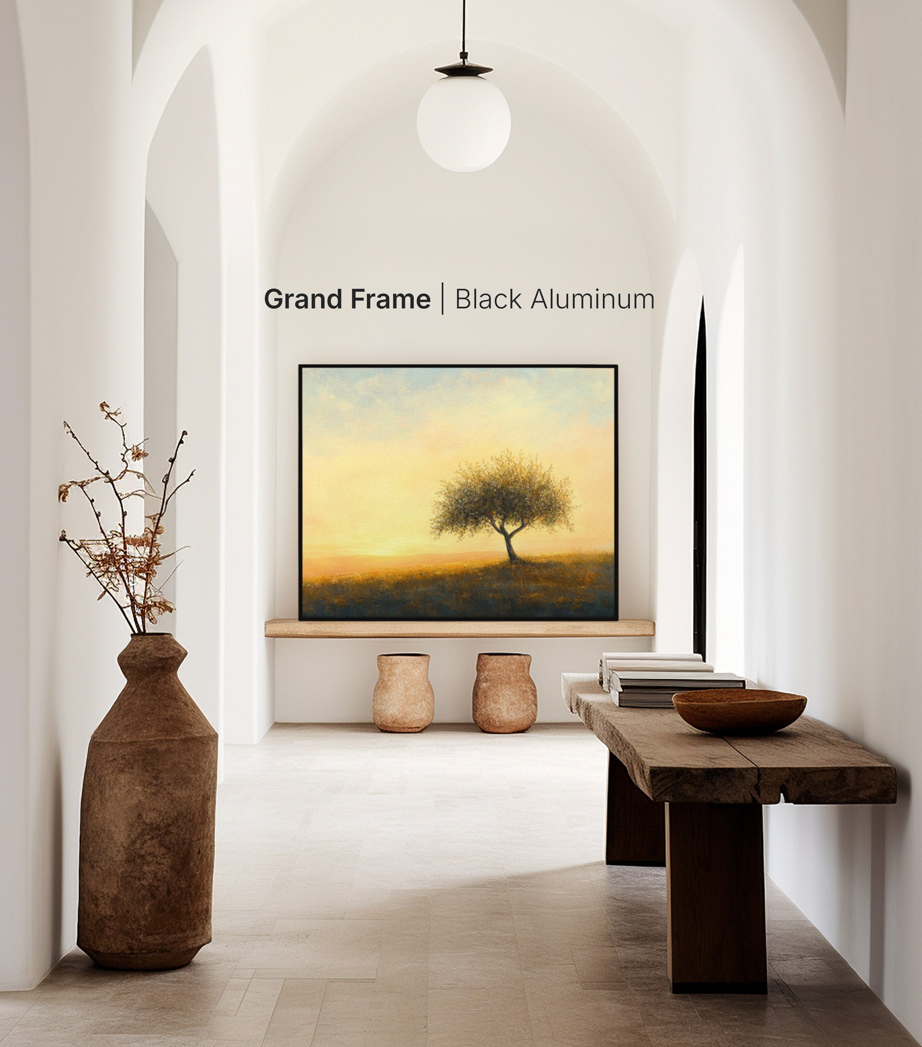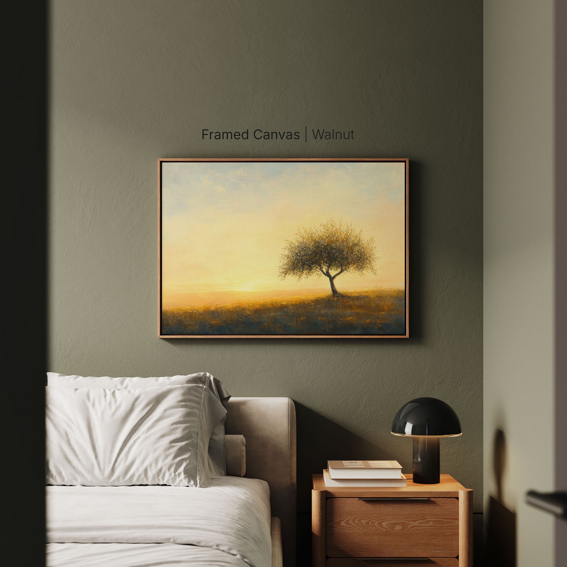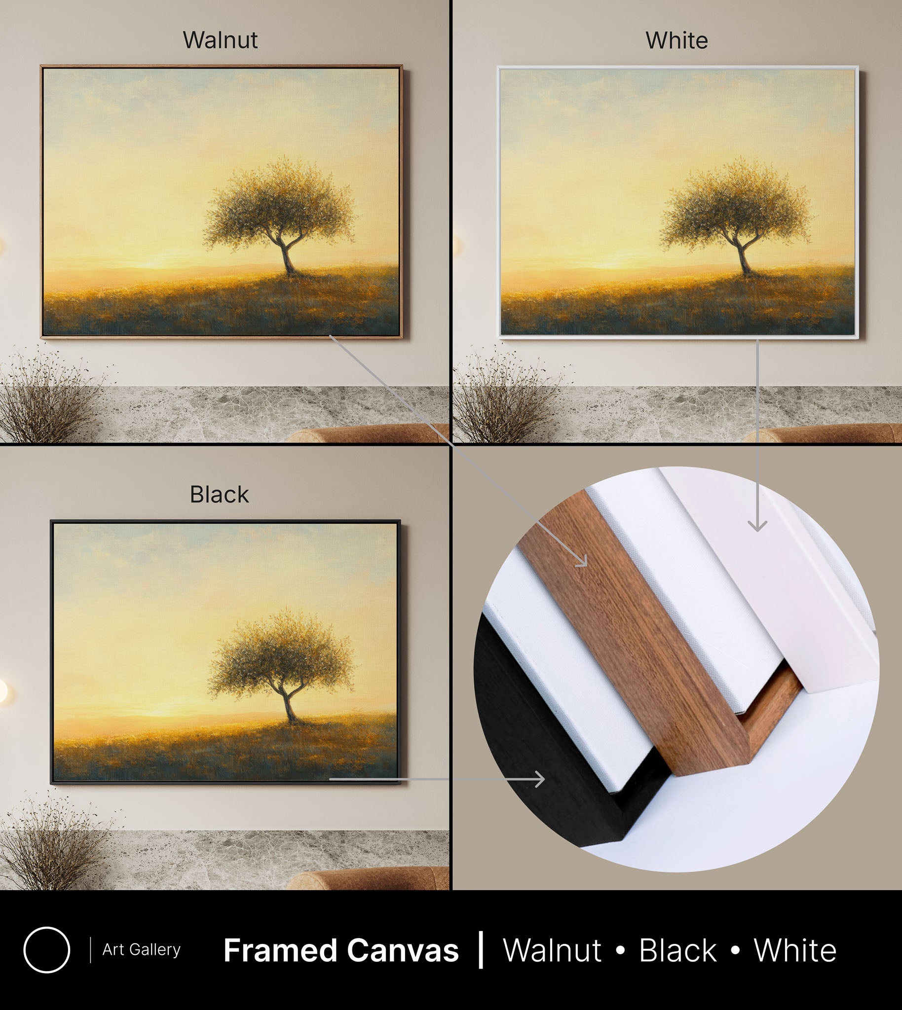 Artist-grade canvas wrap in Walnut, White, or Black wooden floater frame. Ready to hang.
